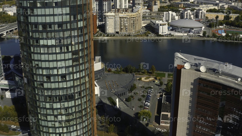 Красивая архитектура современных многоэтажных зданий с офисами. Скриншоты. Бизнес-центры в многоэтажных домах со стеклянным фасадом в центре города. Вид сверху на красивую архитектуру современного города в солнечный летний день