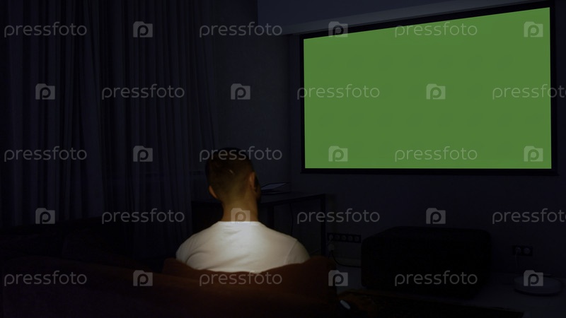 Сзади мужчина, сидящий на диване в гостиной и смотрящий телевизор с зеленым экраном.СМИ.Человек перед телевизором со зеленым хроматическим клавиатурным экраном