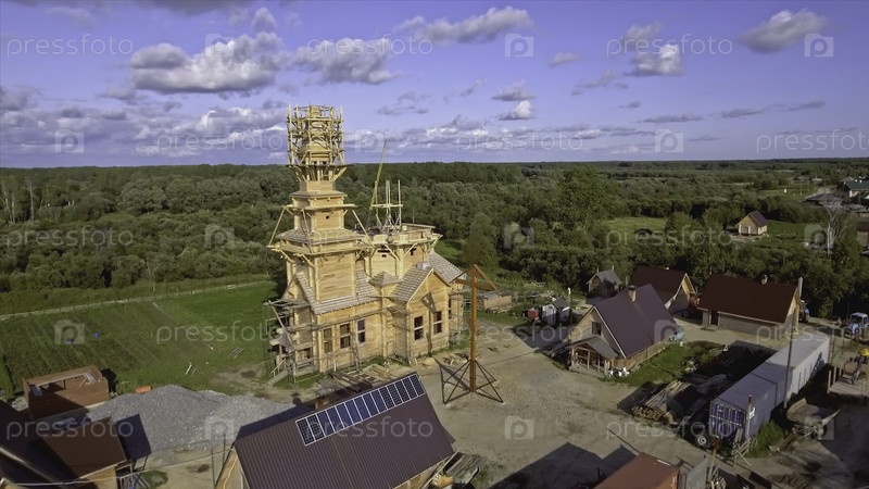 Строительство деревянной церкви в селе. Сценарий. Вид сверху села с деревянными архитектурными зданиями. Строительство деревянной церкви