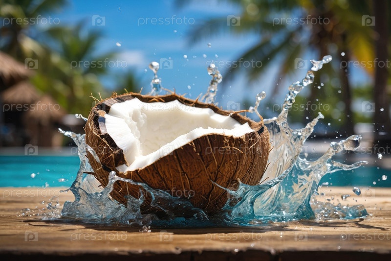 Generative Экзотические фрукты кокосового ореха в распылении воды на летнем бассейне отдых AI фоном