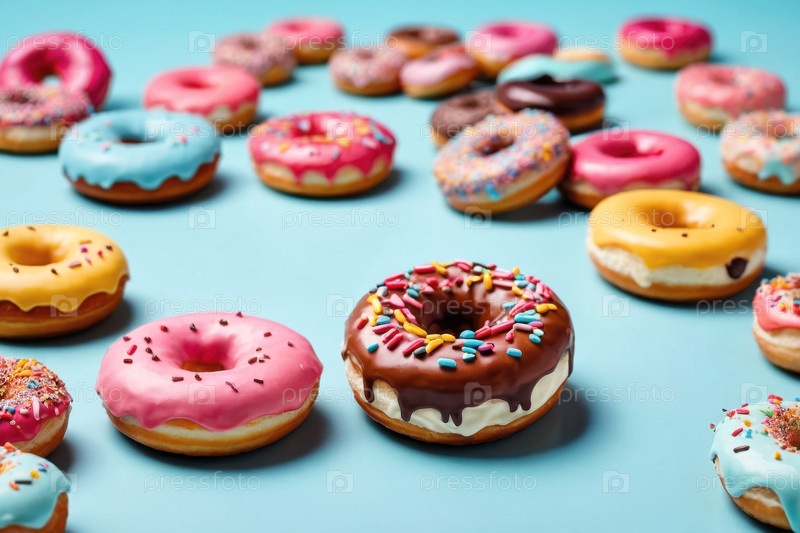 AI Generative Ярко окрашенные пончики пончик на столе, натюрмортная пекарня украшение закуска десерт