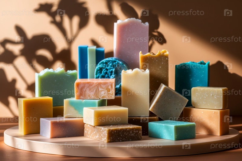 AI Generative Bar piece natural organic aromatic cosmetic handmade soap на стенде на бежевом фоне