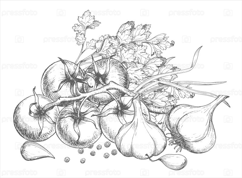 Состав из чеснока, помидоров, петрушки, черного перца и зеленого лука. Векторные чернила ручной работы элементы. Для дизайна упаковки, карточек, обложки, печатных работ, этикеток на продуктах и ткани