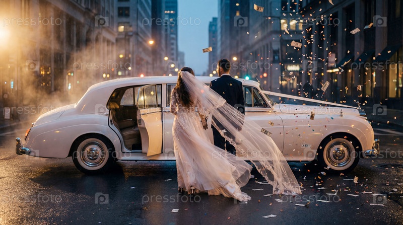 Молодожены садятся в белый свадебный лимузин на фоне города и конфетти из денег
