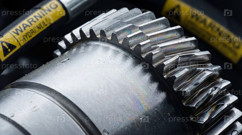 Косозубая металлическая шестерня. Узел механизма двигателя самосвала крупным планом