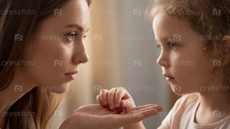 Мать протягивает маленькой дочери на ладони кулон в форме красного сердца