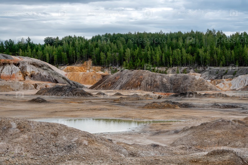 Уральский Марс. необычайно красивый летний пейзаж с красными озерами, цветными склонами и лесом. живописный горный массив. природные ландшафты, впечатляющее небо. природа Урала