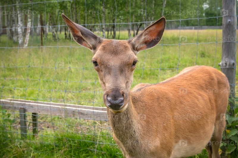 Профиль головы красного оленя. Близкий план молодой самки алтайского марала. Красивое животное. Артиодактильное животное семейства оленей. Ферма для оленев