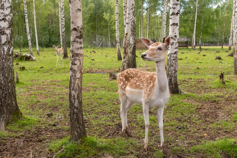 Самка заметила оленя в березовой роще летом