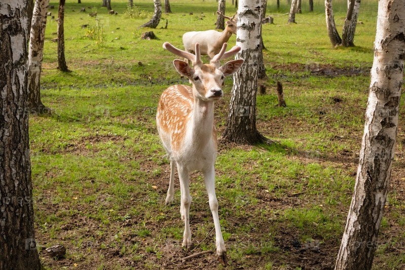 Самца заметил оленя в березовой роще в летний день