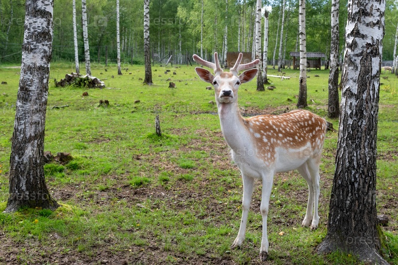 Самец оленя в березовой роще в летний день