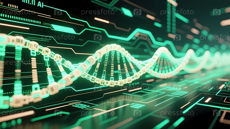 Эта сцена представляет собой светящуюся зеленую спираль ДНК, переплетенную с цифровыми линиями, символизирующей смесь генетики и технологий в футуристической обстановке Generative AI