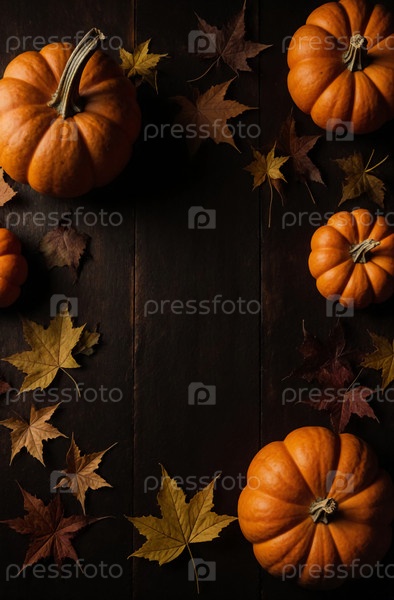Ярко-оранжевые тыквы отдыхают среди ярких осенних листьев, демонстрируя красоту осеннего сезона.Темный деревянный фон добавляет удобную приманку к этому праздничному расположению Generative AI