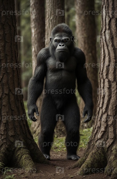 В тихом лесу сильная гуманоидная горилла привлекает внимание, окруженная высокими деревьями.Утренний свет нежно фильтруется через навес, выделяя эту потрясающую фигуру Generative AI