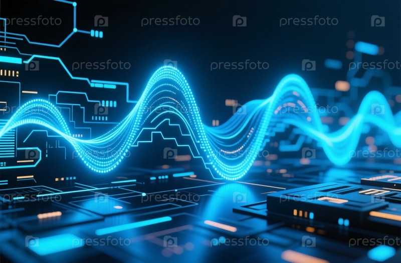 Яркие электрические волны пульсируют по темному холсту, символизируя динамический поток данных в искусственном интеллекте.Это яркое изображение празднует инновации и технологии Генеративный ИИ