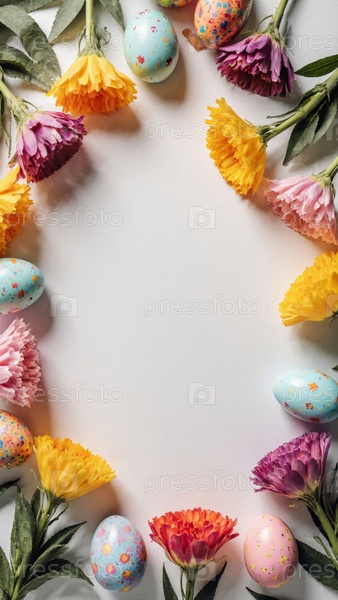Красивые, яркие цветы в розовых, желтых и фиолетовых оттенках окружают круг украшенных яиц, провоцируя чувство весны и веселых праздников Generative AI