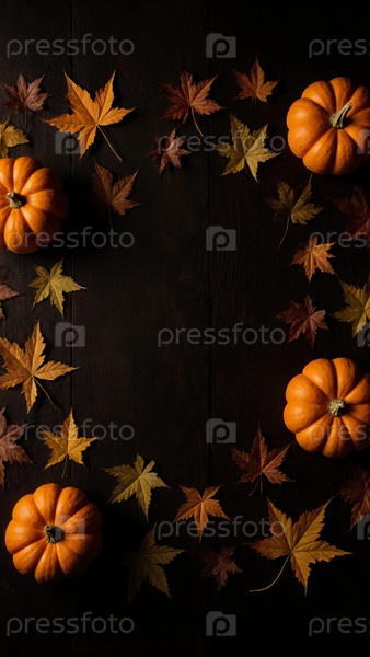 Четыре ярко-оранжевых тыквы отдыхают среди разбросанных красных, оранжевых и желтых листьев, создавая уютную осеннюю атмосферу на темном деревянном фоне Generative AI