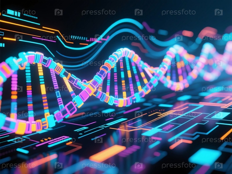 Вибрирующие, изгибающиеся нити ДНК танцуют через темное пространство, освещенное электрическими цветами.Сцена фиксирует слияние науки и технологий в увлекательной футуристической обстановке Generative AI