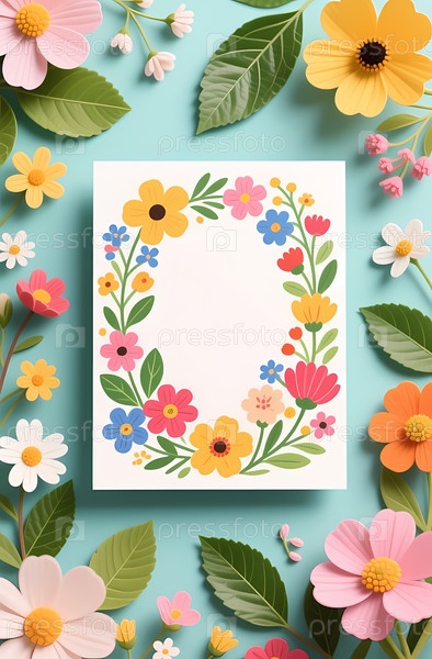 Коллекция ярких бумажных цветов окружает пустую открытку, приглашая сердечные сообщения Generative AI