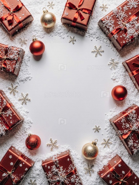 Ярко упакованные подарки с блестящими лентами красиво расположены на мягкой, заснеженной поверхности.Красный и золотой орнаменты добавляют праздничное настроение к радостному рождественскому сезону Generative AI
