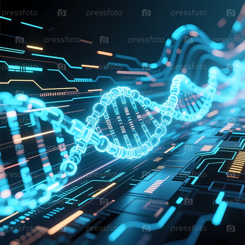 Потрясающее изображение нитей ДНК светит в электрических синих оттенках, переплетаясь с потоками света и сложными цифровыми узорами, символизирующими инновации и открытия Генеративный ИИ