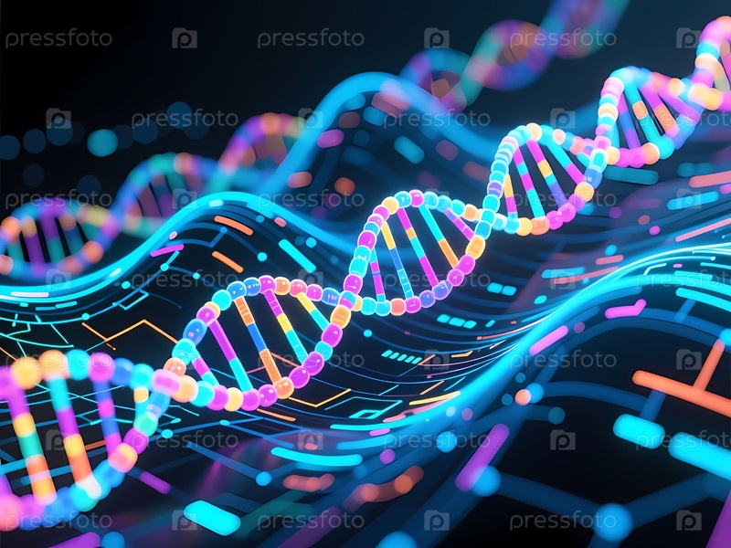 В ярком дисплее красочные синие нити ДНК живо танцуют на темном цифровом фоне.Эта сцена захватывает суть биологической красоты и научных исследований Generative AI