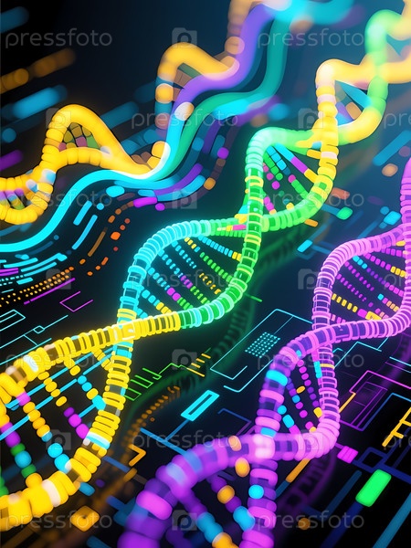 Красочные нити ДНК переплетаются, светятся в оттенках желтого, зеленого и розового на фоне цифровой вселенной.Они символизируют жизнь и технологии, сливающиеся в гармонии Генеративный ИИ