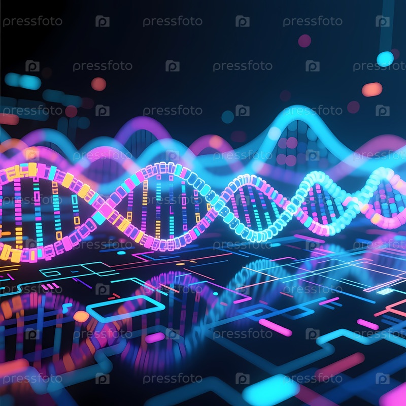 Сложные нити ДНК изгибаются и поворачиваются в оттенках синего и фиолетового на светящемся цифровом фоне Generative AI