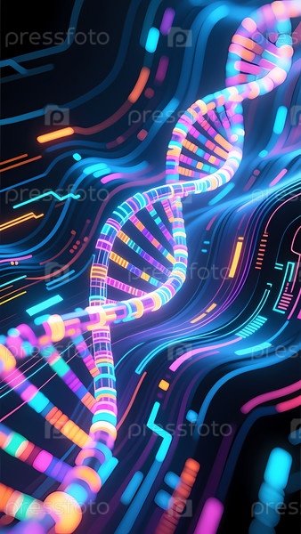 В увлекательной сцене переплетающиеся нити ДНК сияют яркими синими и яркими цветами, создавая потрясающий визуальный образ генетической красоты и сложности, пульсирующей энергией Генеративный ИИ