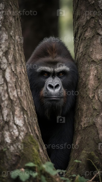 Мощная горилла тихо наблюдает за своим окружением между двумя высокими деревьями.Лес оживляется мягким шумом листьев и пятнистым солнечным светом, фильтрующимся через ветви Generative AI