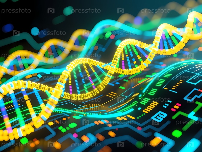 В динамической сцене ярко-желтые и зеленые нити ДНК элегантно изгибаются, окружены красочными узорами, напоминающими схемы обработки данных, символизирующие слияние биологии и технологий Generative AI