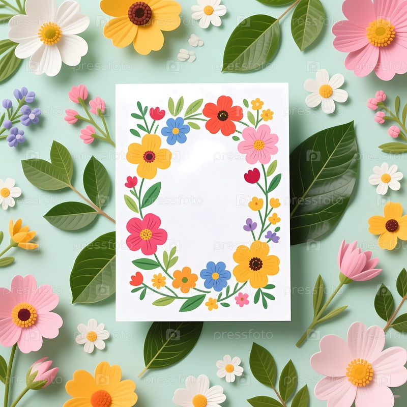 Красочные цветы создают яркую раму вокруг пустой карточки, приглашая к творчеству и теплоте.Эта очаровательная сцена захватывает сущность радостного духа природы и креативности Генеративный ИИ