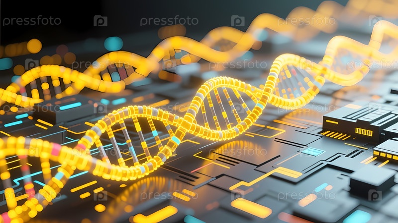 Желтые спирали ДНК изящно скручиваются на фоне освещенных цифровых схем.Эта поразительная комбинация раскрывает гармонию между наукой и инновациями в современном пространстве Генеративный ИИ