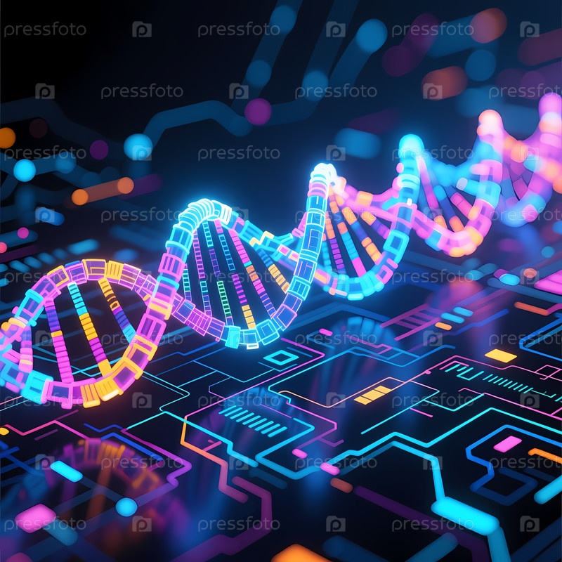 В завораживающем дисплее синие и фиолетовые нити ДНК грациозно переплетятся между светящимися схемами Generative AI