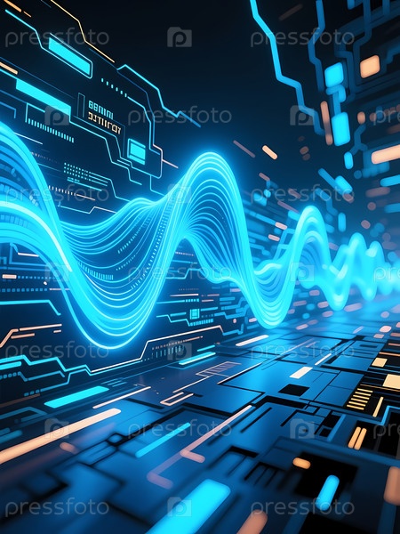 Ярко-синие волны данных танцуют через футуристический цифровой ландшафт, демонстрируя поток информации в художественном отображении технологий и творчества Генеративный ИИ