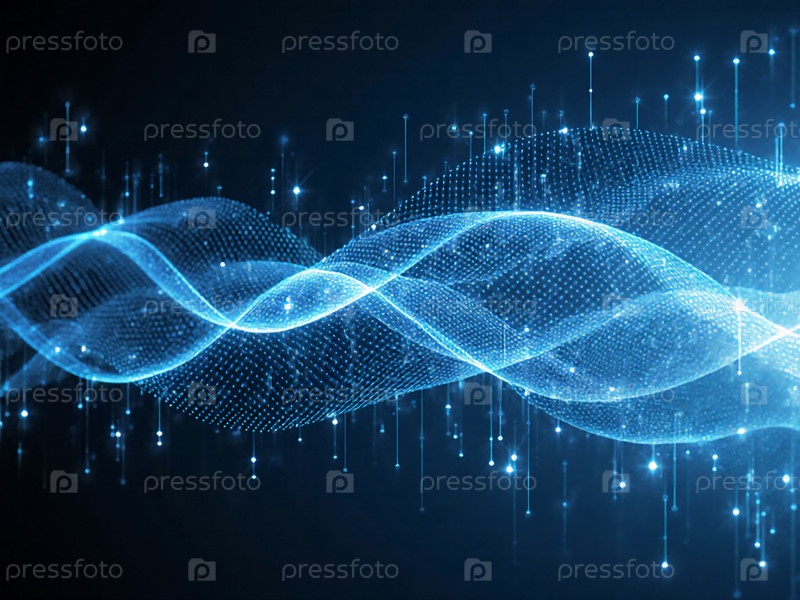 В обширном цифровом ландшафте синие волны информации изящно поворачиваются и вращаются, создавая захватывающий дисплей света Generative AI