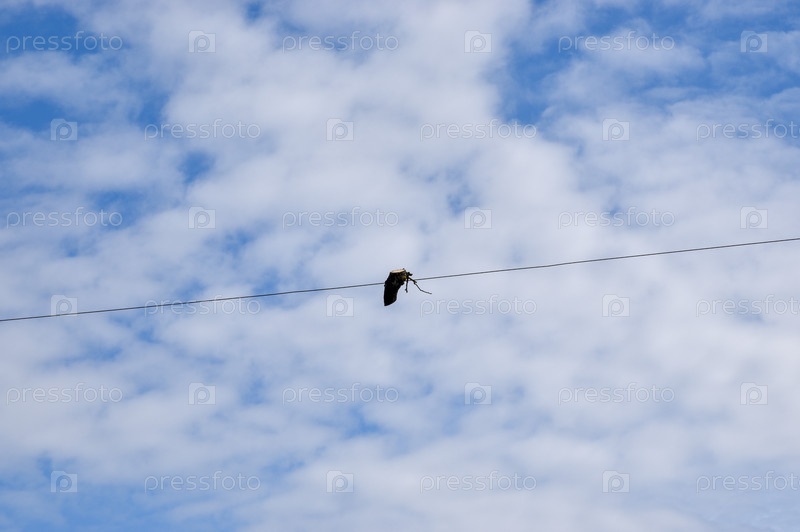 Ветка дерева, застрявшая на линии электропередач на фоне облачного неба