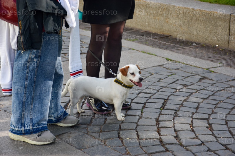 Маленькая белая собака на поводке рядом с хозяевами на брусчатой мостовой, городская прогулка