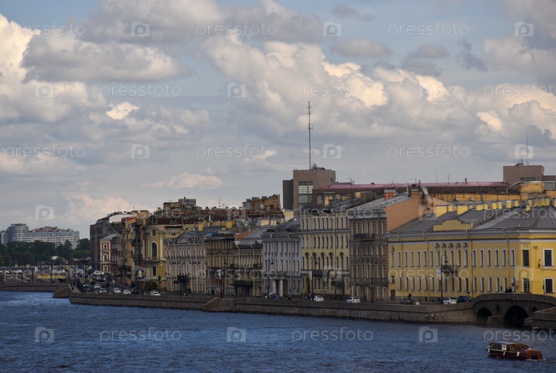 Историческая набережная Санкт-Петербурга с классической архитектурой и прогулочным катером на фоне кучевых облаков