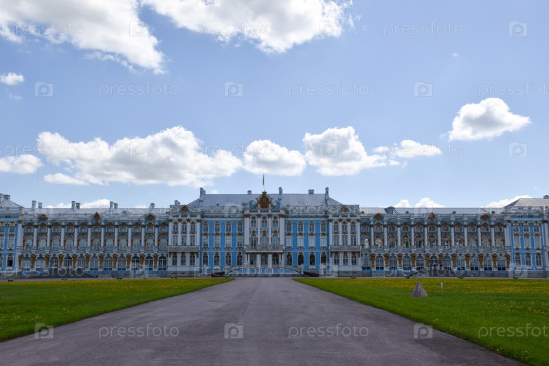 Величественный фасад Екатерининского дворца в стиле барокко под голубым летним небом, Царское Село, Санкт-Петербург