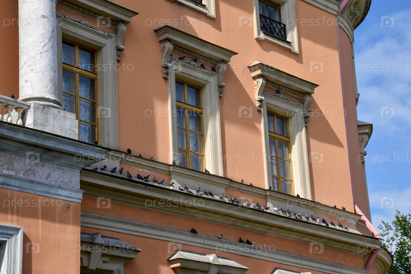 Стая голубей на карнизе фасада старинного дворца в Санкт-Петербурге