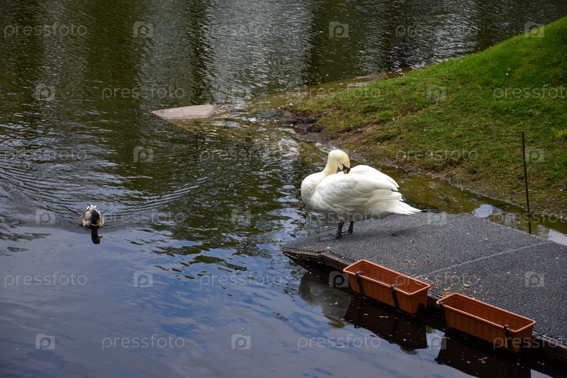 Грациозный белый лебедь на причале и дикая утка в парковом пруду на фоне зеленого берега