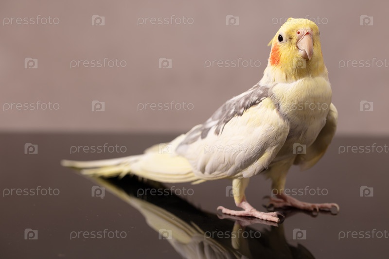 Портрет попугая корелла с розовыми щеками и туфлей на голове