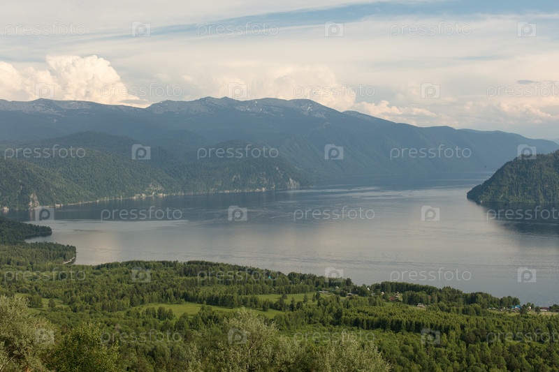 Озеро Телецкое с спокойной водой в летний день.Алтайская территория