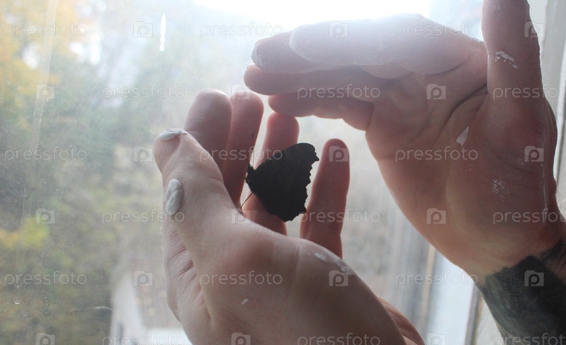 Бабочка-мотылек, сидящая на ладони парня в ближайшем плане
