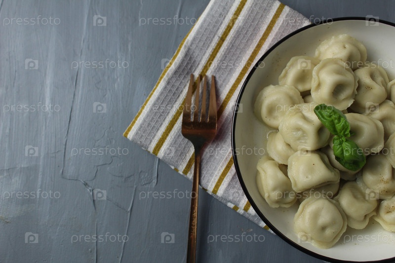 Близкие пельмени на сером фоне с пространством для текста копий. верхний угол