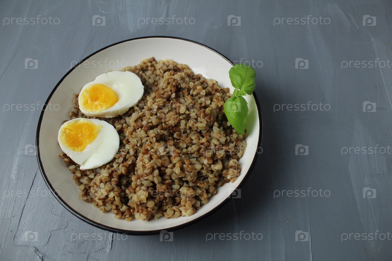 Гречка вареное куриное яйцо зелень на сером фоне с пространством для копирования текста