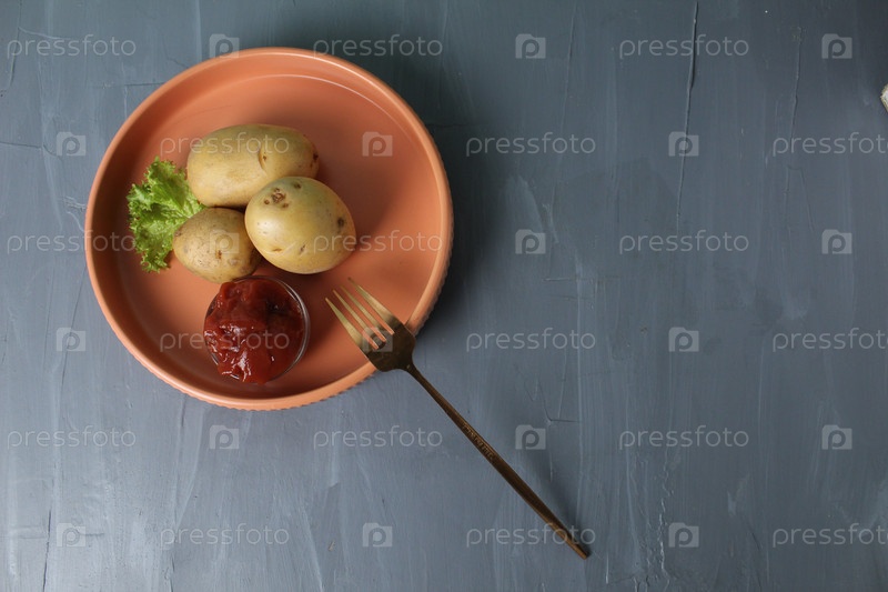 Картофель с кетчупом в современной тарелке.Вегетарианская диета сырой пищи на сером фоне, верхний угол, съемки в студии