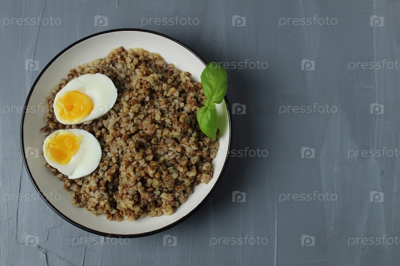 Гречневая каша куриное яйцо зелень базилик верхний вид на сером фоне с пространством для копирования текста. Концепция новых славянских продуктов