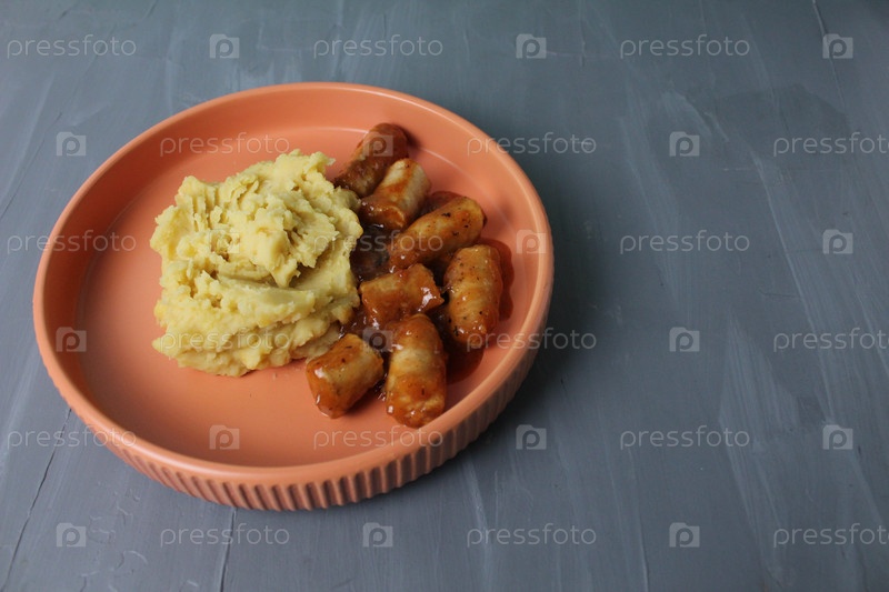 Картофельное пюре с ливкой с колбасой в томатном соусе на персиково-оранжевой тарелке на сером фоне с пространством для копирования текста